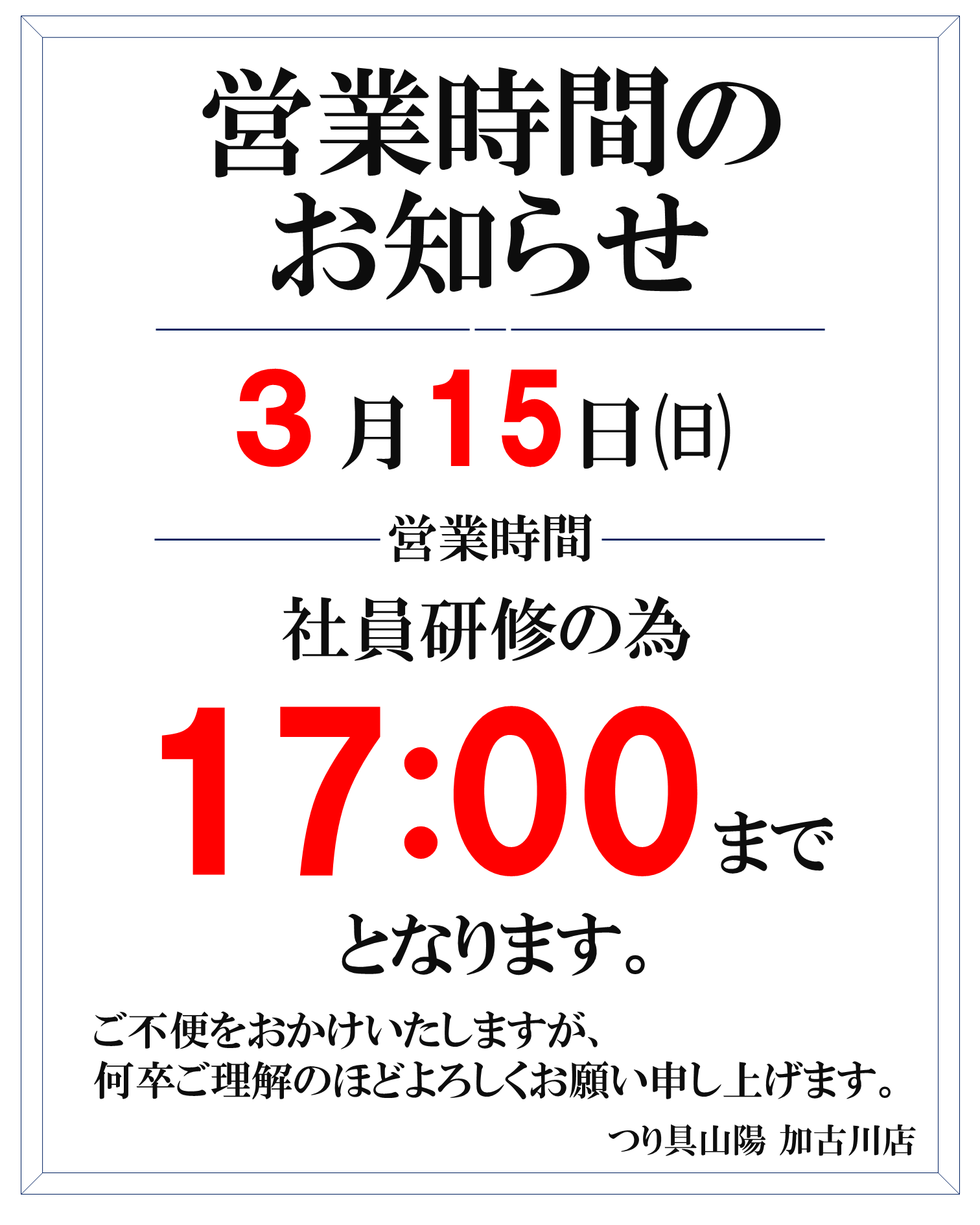 3月15日の営業時間のお知らせ